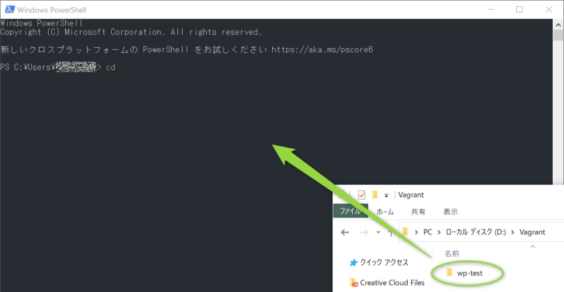 下図の矢印で示すように、作業用ディレクトリを PowerShellの画面へドラッグ & ドロップします。