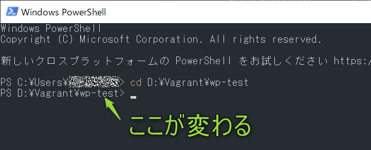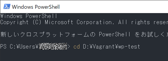 PowerShell上ではまだ作業用ディレクトリの「wp-test」にいるはずなので、そのまま仮想マシンを作成します。(もし作業ディレクトリにいない場合は、cdコマンドで移動してください。)