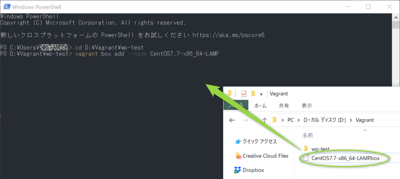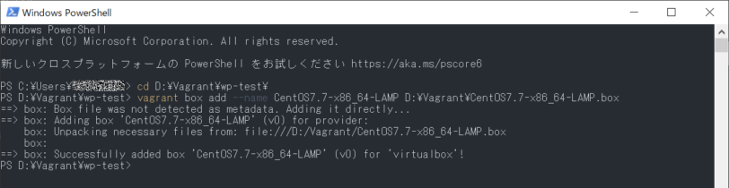D:\Vagrant\CentOS7.7-LAMP.box ( Boxファイルの名前は用意したものに読み替えてください。)Boxファイルを用意したらPowerShellを起動し、作業用ディレクトリまで移動します。
