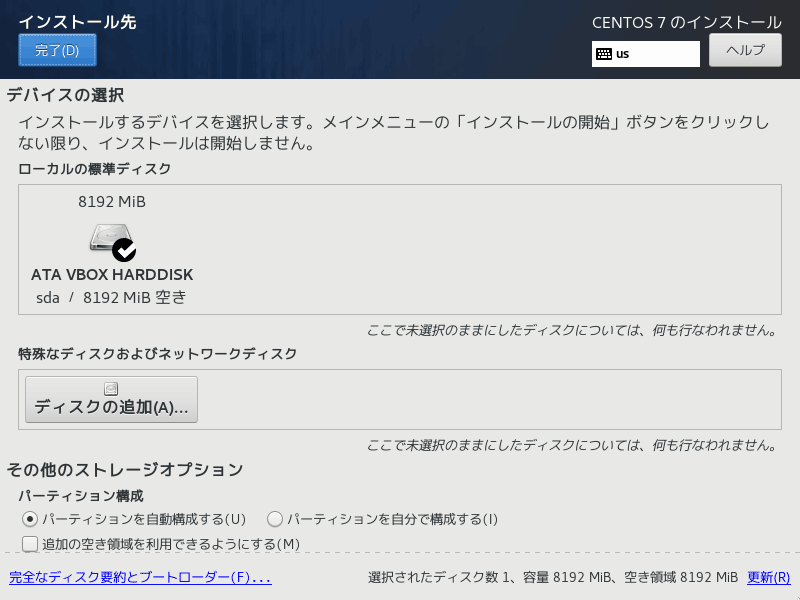 システムの「インストール先 (D)」をクリックするとインストール先という画面に移ります。今回はパーテーションの設定は行いません。そのまま左上の「完了 (D)」を押します。