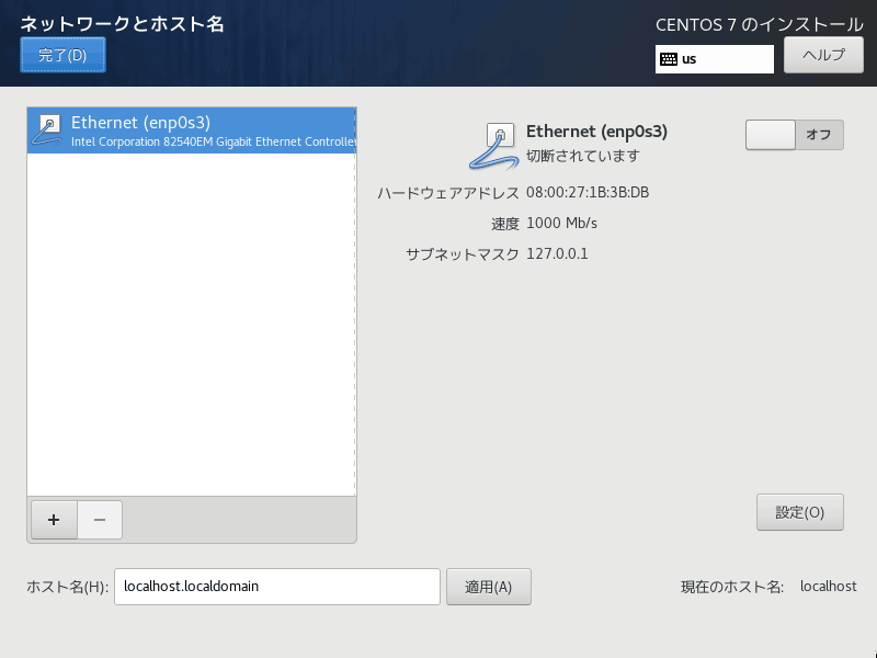 右側の Ethernet の「オフ」になっている部分をクリックして「オン」に切り替えたあと、ホスト名が「localhost.localdomain」になっていることを確認して「完了 (D)」を押します。