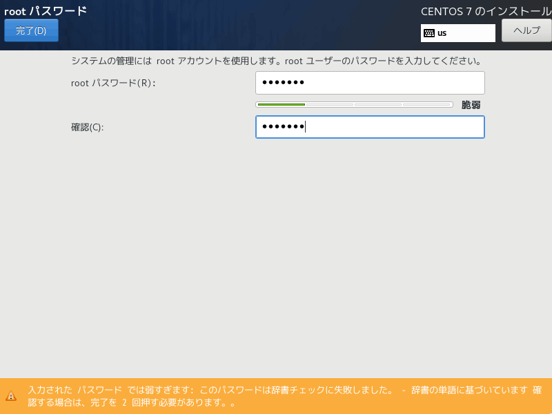 パスワードが弱いのでこのまま使うかどうかの確認です。警告文に従って「完了 (D)」を 2 回押して設定を完了させます。