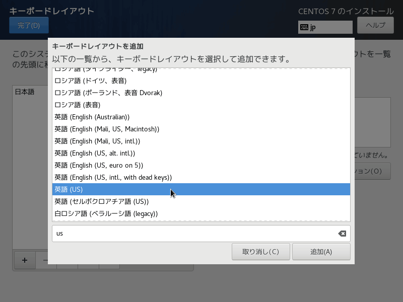 レイアウトの追加画面がポップアップするので、下のカーソルがある部分に「us」と打ち込み、英語 (US) というのが選択された状態で右下の「追加 (A)」をクリックします。